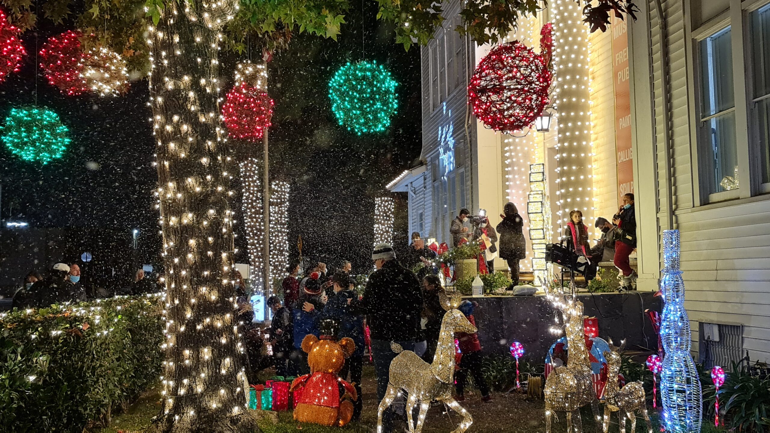 The holiday event was slated to start at 6:00 PM, but lines began forming on the steps of the museum as early as 5:30 with excitement building by the minute. Children were giddy over the beautifully lit decorations—from the sparkling white polar bears to the life-sized snowman. But the hit of the night was the Snowfall Experience, which offered the children a taste of snow, something rarely seen in Southern California.